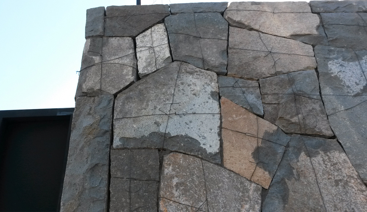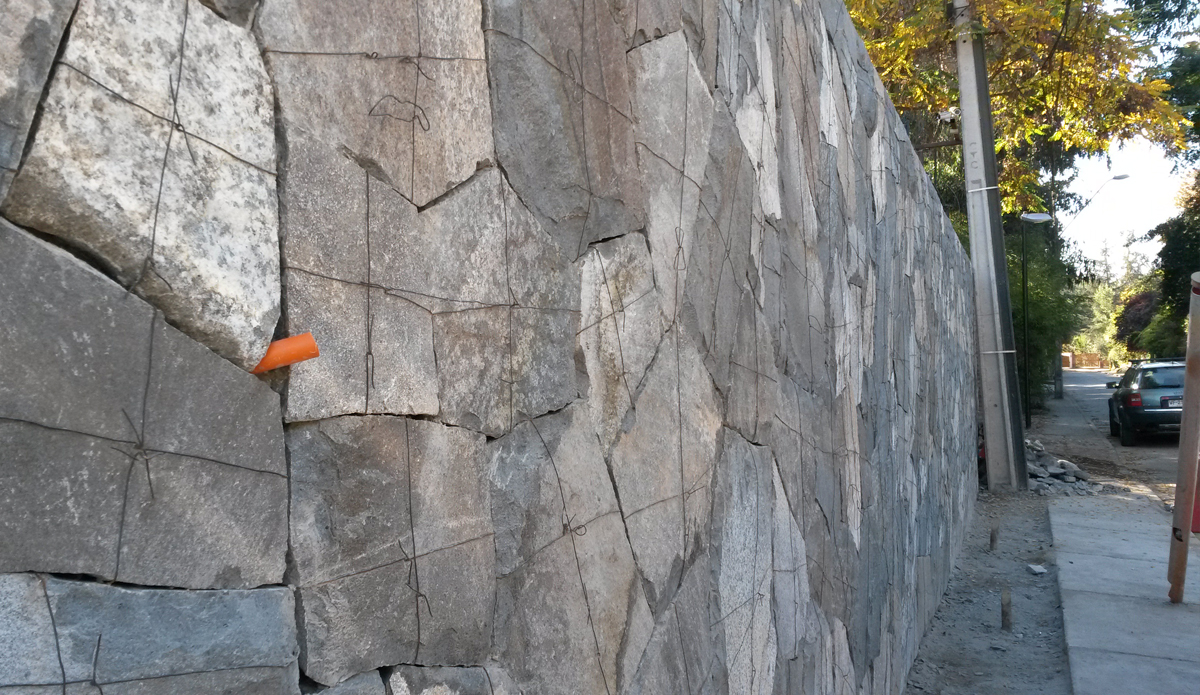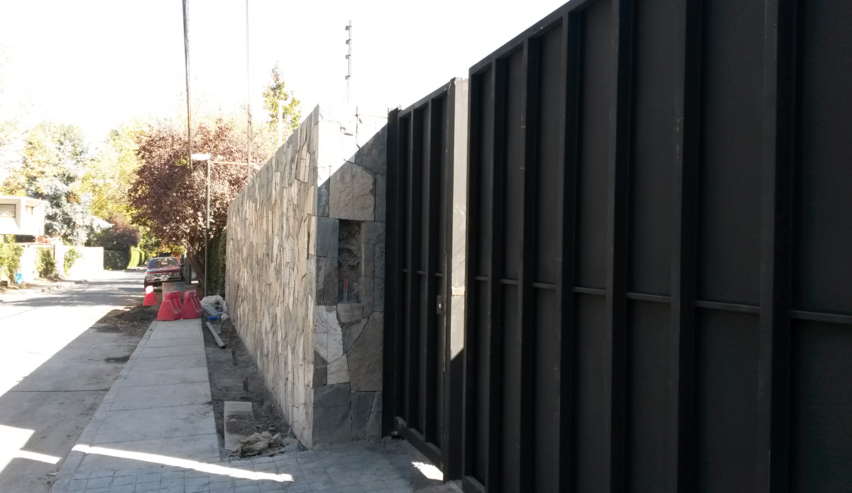 Construcción de cierre principal con revestimiento de piedra. Casa Lo Barnechea, Santiago.